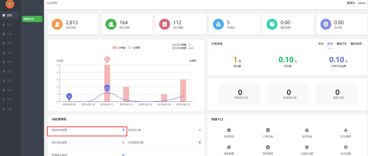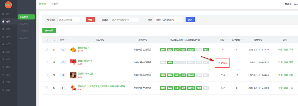 商品发布/编辑页面可以设置该商品预警库存,当库存减少到设置数据时,后台商品列表页和数据总览页提示库存警告。